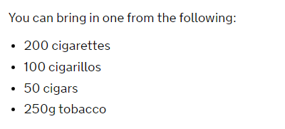 ·Tobacco allowance 烟类允许携带量